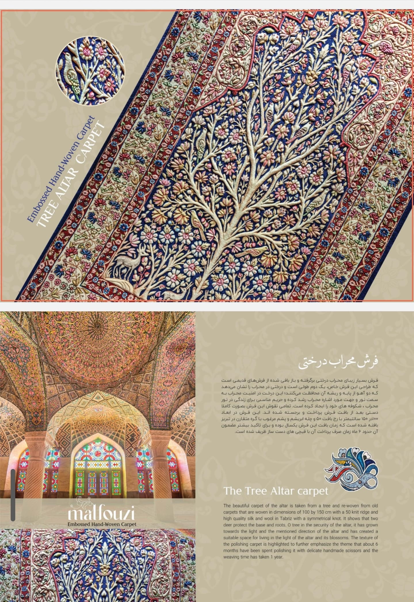 Malfouzi believes carpets speak to us, and their motifs must be read. He sees embossing and storytelling as elevating Persian carpets from floor coverings to works of art displayed on walls. His Greatest dream is to create an embossed design of the legendary “Baharistan” carpet, a treasure of the Sassanid era. With numerous accolades, including Japan’s Seto Toyama International Handicrafts Award, and participation in prestigious exhibitions, Yashar Malfouzi has become a renowned name in the world of Persian carpet artistry. His creations, blending tradition with innovation, bring the culture and history of Iran to life in a truly unique way.